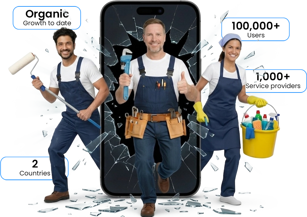 Users access home and commercial services through a structured app-based experience that drives bookings, demand generation, and market activity.