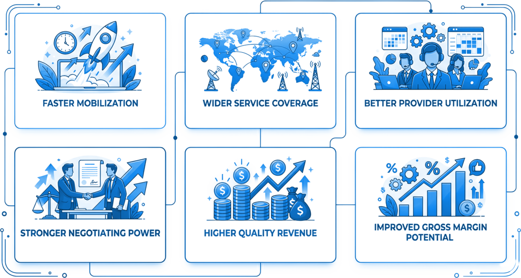 The same provider network supports larger commercial, retail, and institutional requirements, improving utilization, readiness, and scalability.